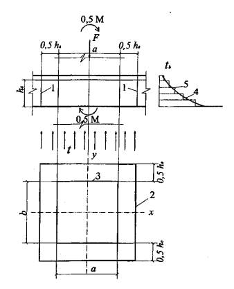 Рис. 4.1. Предел огнестойкости по теплоизолирующей способности плит (стен) при одностороннем нагреве бетона от стандартного пожара 1 - тяжелого бетона на силикатном заполнителе; 2 - то же, на карбонатном 5. РАСЧЕТ ПРЕДЕЛА ОГНЕСТОЙКОСТИ ПО ПОТЕРЕ НЕСУЩЕЙ СПОСОБНОСТИОсновные условия5.1. Расчет предела огнестойкости по потере несущей способности R железобетонных элементов следует производить на основе нелинейной деформационной модели согласно пп. 8.1-8.8. Расчет огнестойкости по потере прочности железобетонных элементов допускается выполнять по предельным усилиям (предельные состояния первой группы) до полной непригодности к эксплуатации вследствие потери несущей способности. Расчет огнестойкости по потере несущей способности железобетонных элементов при огневом воздействии производится в следующей последовательности. 1. Для принятого по проекту размера сечения, вида бетона и требуемого предела огнестойкости R по приложениям А и Б находят распределение температуры в бетоне сечения элемента и температуру нагрева арматуры от стандартного пожара длительностью, равной пределу огнестойкости. 2. Если принимают коэффициент γbt, зависящий от температуры сжатого бетона, то сначала определяют Rbnt по формуле (2.1) для каждой части сжатого сечения и его значения подставляют в формулы прочности нормальных и наклонных сечений с действительными размерами. Среднюю температуру бетона сжатой зоны при ξ ≤ ξR допускается принимать для плит по температуре бетона, расположенного на расстоянии 0,1h0, для других элементов - на расстоянии 0,2 h0t от сжатой нагреваемой грани сечения; при х = ξRh0 и х = h0 - на расстоянии, равном 0,5x от сжатой грани сечения. При расчете по приведенным сечениям h0 заменяют на h0t. Если сжатая зона сечения расположена у ненагреваемой грани сечения, то средняя температура бетона сжатой зоны в балках, нагреваемых с трех других сторон, определяется по рис. 5.1.