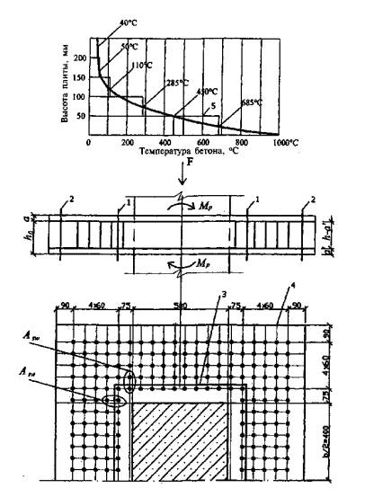 Прочность сечения в пролете определяем по формуле: М = Rst·As(h0 - 0,5x) = 0,91·435·769(166-0,5·17,3) = 47,8 кН·м > 33 кН·м. Проверяем прочность опорного сечения. Расчетный момент Моп = 61,5 кН·м. Прогрев сжатой зоны бетона до критической температуры бетона по рис. А2 приложения А - at = 53 мм. Рабочая высота сечения h0t = h0 - a - at = 220-54-53 = 113 мм. Высота сжатой зоны по (5.9) без учета сжатой арматуры с учетом γb2 = 0,9 на опоре равна