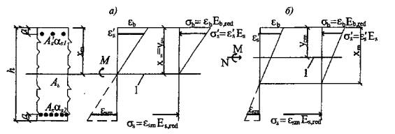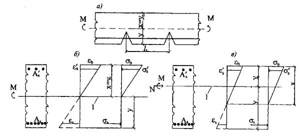 Рис. 7.1. Схема напряжений и деформаций в сечении с трещиной при действии изгибающего момента (а, б), изгибающего момента и продольной силы (в) 1 - центр тяжести приведенного сечения