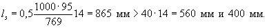 Принимаем ls = 400 мм. При температуре арматуры 495 °С коэффициент γtt = 0,21 (табл. 2.2) и Rbt,ser = 1,95·0,21 = 0,41 МПа. Находим коэффициент ψs по (7.31) Для температуры нагрева бетона на уровне растянутой арматуры 495 °С по табл. 2.5 находим αsc = -1,8·10-6 °С-1. Тогда деформация усадки бетона при остывании составит по (7.16) εsc = -1,8·10-6·495 = -0,99·10-3. Знак «минус» свидетельствует о том, что при остывании в бетоне остаются деформации расширения и они уменьшают деформацию растяжения от нагрузки. Ширина раскрытия трещин по (7.1) при φ1 = 1,4, φ2 = 0,5, φ3 = 1,0 и ψ5 =0,89 равна
