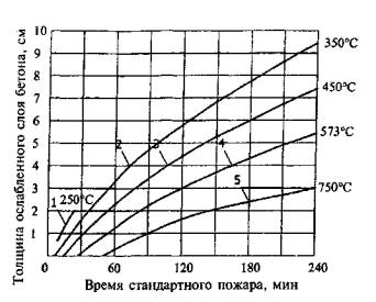 Рис. 9.1. Нарушение структуры бетона после высокотемпературного огневого воздействия с температурой 1 - до 250 °С - взрывообразное хрупкое разрушение наружного слоя бетона с влажностью более 3,5 %; 2 - от 250 до 350 °С - в бетоне образуются в основном трещины от температурной усадки бетона; 3 - до 450 °С - в бетоне образуются трещины преимущественно от разности температурных деформаций цементного камня и заполнителей; свыше 450 °С - нарушение структуры бетона из-за дегидратации Са(ОН)2, когда свободная известь в цементном камне гасится влагой воздуха с увеличением объема; 4 - свыше 573 °С - нарушение структуры бетона из-за модификационного превращения α-кварца в β-кварц в граните с увеличением объема заполнителя; 5 - выше 750 °С - структура бетона полностью разрушена 9.17. При высокотемпературном воздействии свыше 350 °С в структуре бетона образуются и развиваются микротрещины в кристаллизационной решетке цементного камня. Внутренние напряжения и микротрещины, которые образуются при нагревании из-за различия температурных деформаций в бетоне, снижают прочность и повышают деформативность бетона. После нагрева бетона до температуры выше 450 °С в охлажденном состоянии свободная окись кальция (известь) цементного камня гасится влагой воздуха, при этом происходит значительное увеличение объема минерала с нарушением структуры бетона. Температурная усадка цементного камня при одновременном расширении заполнителей нарушает связи между ними и разрывает цементный камень на отдельные части. Модификационное превращение кристаллического α-кварца в β-кварц в граните при температуре 573 °С сопровождается значительным увеличением объема минерала и снижением прочности заполнителя. Охлаждение бетона водой после пожара вызывает дополнительное нарушение структуры в наружных слоях бетона. При температуре свыше 750 °С из цементного камня удаляется химически связанная вода и продолжает нарушаться структура бетона из-за разности температурных деформаций вяжущего и заполнителей. 9.18. В арматуре классов А240, А300, А400 и А500 после нагрева до 600 °С, классов А540, А600, А800, А1000 после нагрева до 400 °С и классов В500, Вр1200 - Вр1500, К1400 - К1500 после нагрева до 300 °С прочностные свойства восстанавливаются. 9.19. Для обеспечения огнесохранности и ремонтопригодности железобетонной конструкции после пожара необходимо, чтобы разрушающий слой бетона, нагретый до 450 °С, после пожара не оказывал влияния на дальнейшую эксплуатацию конструкции. Это можно обеспечить расстоянием от оси арматуры до нагреваемой грани. 9.20. При стандартном пожаре длительностью 90 мин расстояние от оси арматуры до нагреваемой грани бетона должно быть не менее 35 мм, при 120 мин - 45 мм, при 150 мин - 55 мм, при 180 мин - 60 мм и при 240 мин - 75 мм с учетом слоя штукатурки. 9.21. Во избежание выпучивания продольной арматуры при ее нагреве во время пожара необходимо предусмотреть конструктивное армирование хомутами и поперечными стержнями. 9.22. Конструирование элементов должно обеспечить нагрев ненапрягаемой арматуры во время пожара не более 500 °С, предварительно напряженной арматуры - не более 100 °С. 9.23. Если фактические прогиб и раскрытие трещин после пожара превышают допустимые значения, но не препятствуют нормальной эксплуатации здания и сооружения, допускается не предусматривать усиление конструкции либо снижение нагрузки. 10. ПО