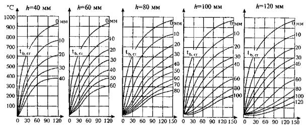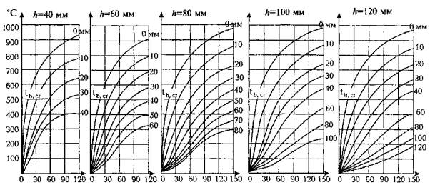 Длительность стандартного пожара, мин Рис. А.1. Температура прогрева тяжелого бетона на силикатном заполнителе в плитах и стенах высотой сечения 40, 60, 80, 100 и 120 мм при одностороннем огневом воздействии 0-120 - глубина прогрева бетона от нагреваемой поверхности