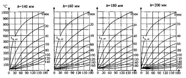 Длительность стандартного пожара, мин Рис. А.2. Температура прогрева тяжелого бетона на силикатном заполнителе в плитах и стенах высотой сечения 140, 160, 180 и 200 мм при одностороннем огневом воздействии 0-200 - глубина прогрева бетона от нагреваемой поверхности