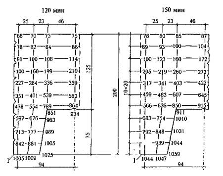Условие (5.19, а) выполняется и плита обеспечивает установленный предел огнестойкости по потере несущей способности R150. Пример 5. Дано. Железобетонная плита перекрытия; высота плиты h = 200 мм; монолитно опирается на железобетонные стены толщиной 300 мм; бетон класса В25; Rbn = 18,5 МПа; арматура класса А500; Rsn = 500 МПа; верхняя арматура Ø12 с шагом 300 мм уложена в двух направлениях по всей площади плиты; нижняя арматура Ø14 с шагом 150 мм, 50 % арматуры обрывается в одной четверти пролета; пролеты плиты в осях - короткой стороны l1 = 7,2 м, длинной стороны l2 = 9,7 м; толщина защитного слоя бетона 20 мм; нормативная временная и постоянная длительно действующая нагрузка q = 10000 Па. Требуется определить расчетом обеспечение плитой перекрытия установленного предела огнестойкости по потере несущей способности R150. Расчет. Расчетные пролеты плиты при монолитном опирании на стены l1 = 7,2 - 0,3 = 6,9 м, l2 = 9,7 - 0,3 = 9,4 м. Нижнюю арматуру обрывают на расстоянии от длинной стороны a1 = l2/4 = 6,9/4 = 1,73 м, от короткой стороны а2 = l2/4 = 9,4/4 = 2,35 м. Отношение стороны плиты l2/l1 = 9,4/6,9 = 1,36 - плита рассчитывается как работающая в двух направлениях. Рабочая высота сечения плиты: в направлении l1 в пролете h01 = 200 - 20 - 7 = 173 мм; на опорах h0I = h'0I = 200 - 20 - 6 = 174 мм; в направлении l2 в пролете h02 = 200 - 20 - 14 - 7 = 159 мм; на опорах h0II = h'0II = 200 - 20 - 12 - 6 = 162 мм. При длительности стандартного пожара 150 мин, равной установленному пределу огнестойкости R150, по приложению А, рис. А.2, находим температуры прогрева бетона и арматуры для плиты h = 200 мм из бетона на силикатном заполнителе (рис. 5.11).