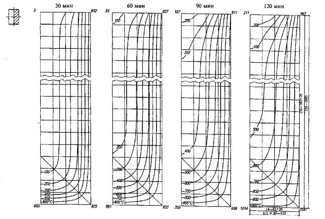 Рис. Б.4. Температура прогрева бетона на силикатном заполнителе в двутавровых балках с шириной полок 360 мм и высотой а - 80-60 мм; б - 80- 120 мм при трехстороннем огневом воздействии длительностью 30, 60, 90 и 120 мин