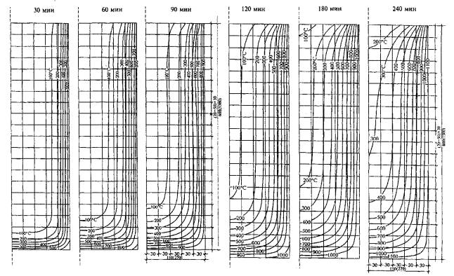 Рис Б.2. Изотермы в бетоне балок шириной 300-540 мм и высотой 600-1500 мм при трехстороннем огневом воздействии стандартного пожара длительностью 30, 60, 90, 120, 180 и 240 мин