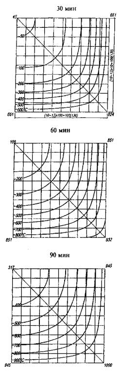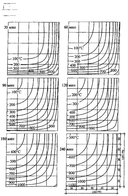 Рис. Б.5. Температура прогрева бетона в колоннах сечением от 200×200 мм до 260×260 мм при четырехстороннем воздействии пожара длительностью 30, 60 и 90 мин