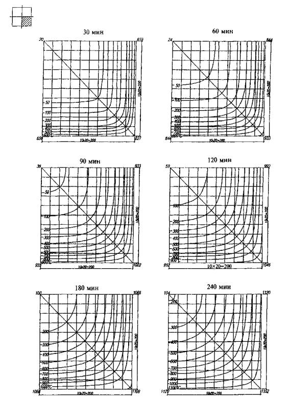 Рис. Б.7. Температура прогрева бетона в колоннах сечением 400x400 мм и более при четырехстороннем воздействии пожара длительностью 30, 60, 90, 120, 180 и 240 мин Приложение ВОСНОВНЫЕ БУКВЕННЫЕ ОБОЗНАЧЕНИЯУсилия от нагрузки и температуры в поперечном сечении элемента при огневом воздействии