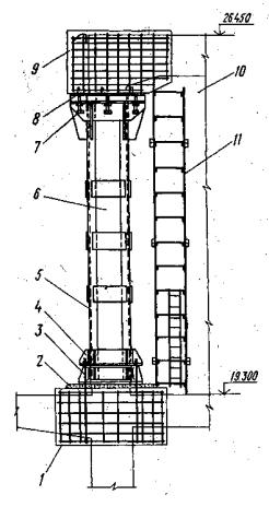 колонн длиной Все работы по усилению следует производить с использованием инвентарных строительных лесов. Усиление колонны с разрушенными ранее выполненными обоймами усиления необходимо производить с частичным разгружением колонн в такой технологической последовательности: обеспечить снижение уровня загруженности колонн до 0,4Nu по отношению к основному сечению колонн путем остановки котла с выпуском воды и с установкой разгружающих - конструкций; установить разгружающие конструкции с контролем значений усилий в них по показаниям манометров насосной станции, подсоединенной к гидродомкратам в следующем порядке (рис. 8): приварить к металлическим опорам котла опорные столики, установить шпальные клети под разгружающие стойки, смонтировать стойки и разгружающие ригели, выполнить включение разгружающих конструкций в работу при помощи гадравлических домкратов; выполнить разборку разрушенных обойм с использованием отбойных молотков в строгом соответствии с требованиями пп. 4.4-4.5 [7]; установить на каждом пятом оголенном продольном стержне арматуры тензодатчики с целью определения изменения напряжений в оставшихся стержнях при их последовательном удалении газовой резкой и возможности контроля или корректировки требуемого значения разгружающей нагрузки колонн; удалить слабопрочный бетон по поверхности усиливаемой колонны; усиление колонны после удаления обоймы выполнять аналогично по изложенной выше технологии производства работ.