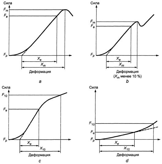 где Fm - максимальная сила, Н; А0 - первоначальная площадь поперечного сечения образца, мм2. 8.1.2 Относительная деформация Определяют положение точки «нулевой деформации». Продлевают до линии «нулевой силы» Fp наиболее прямолинейный участок графика зависимости деформации образца от сжимающей силы, угол наклона которого максимален (см. 5.4). От точки «нулевой деформации», соответствующей предварительному сжимающему давлению Fp = (250 ±10) Па, определяют все значения деформации образца. Примечание - Примеры определения положения точки «нулевой деформации» приведены на рисунке 1. Относительную деформацию εm, %, вычисляют по формуле