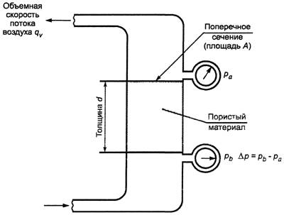 где qv - объемная скорость потока воздуха, проходящего через образец, м3/с; А - площадь поперечного сечения образца, м2. 3 Сущность методов3.1 Метод определения сопротивления продуванию постоянным потоком воздуха (метод А)Метод заключается в прохождении регулируемого однонаправленного потока воздуха через образец, имеющий форму кругового цилиндра или прямоугольного параллелепипеда, и измерении перепада давления между двумя свободными лицевыми поверхностями образца (см. рисунок 1).