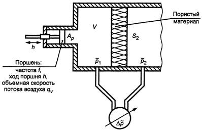 50 % площади опоры. Диаметр отверстий в держателе должен быть не менее Примечание - В отдельных случаях необходимо увеличивать суммарную площадь отверстий с тем, чтобы не ограничивать поток воздуха, проходящий через образец. В этом случае сопротивление продуванию потоком воздуха держателя (измеренное при расходе воздуха, превышающем максимальный расход воздуха при испытании образца) должно быть менее 1 % значения сопротивления продуванию испытуемого образца. 4.2.2 Устройство, создающее переменный поток воздухаПеременный поток воздуха создают поршнем, совершающим синусоидальные колебания частотой примерно 2 Гц. Среднеквадратичное значение объемной скорости переменного потока воздуха qvr.m.s., м3/c определяют по формуле