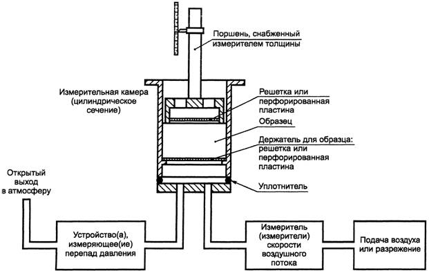 Рисунок 3 - Схема установки с цилиндрической измерительной камерой для определения сопротивления продуванию по методу А 4.1.1 Измерительная камераИзмерительная камера должна иметь форму кругового цилиндра или прямоугольного параллелепипеда. Пример цилиндрической камеры приведен на рисунке 3. Если поперечное сечение камеры имеет форму круга, то ее внутренний диаметр должен превышать Поперечное сечение камеры, имеющей форму прямоугольного параллелепипеда, должно быть предпочтительно квадратное. В этом случае длина стороны квадрата должна быть не менее Полная высота камеры должна быть такой, чтобы в ней создавался ламинарный однонаправленный поток воздуха, входящий в образец и выходящий из него. Высота камеры должна быть не менее чем на Образец должен располагаться внутри измерительной камеры (если необходимо, то на перфорированном держателе) достаточно высоко над основанием камеры. Перфорированный держатель должен иметь равномерно распределенные отверстия, суммарная площадь которых должна быть не менее 50 % площади держателя. Диаметр отверстий в держателе должен быть не менее Примечание - Допускается в отдельных случаях увеличивать суммарную площадь отверстий, чтобы не ограничивать поток воздуха, проходящий через образец. Места соединения приборов для измерения давления и объемной скорости потока воздуха с камерой должны быть герметичными, не допускать утечек воздуха и располагаться ниже перфорированного держателя. 4.1.2 Устройство, создающее поток воздухаРекомендуется использовать устройства, позволяющие создавать пониженное давление воздуха, например водоструйный или вакуумный насос. Допускается использовать системы нагнетания, создающие повышенное давление (воздушный компрессор и т.д.) при условии, что они не будут загрязнять воздух, поступающий в образец. Устройство, создающее поток воздуха, должно обеспечивать регулирование потока воздуха и его стабильность в нижней части измерительной камеры. Устройство должно также обеспечивать такую интенсивность потока воздуха, чтобы его скорость была бы достаточно низкой для обеспечения измерения сопротивления продуванию независимо от скорости. Рекомендуется использовать устройство, обеспечивающее снижение скорости потока воздуха не более 0,5∙10-3 м/с. 4.1.3 Прибор для измерения объемной скорости потока воздухаПрибор для измерения объемной скорости потока воздуха устанавливают между устройством, создающим поток, и образцом, находящимся внутри измерительной камеры, как можно ближе к образцу. Прибор должен обеспечивать измерение объемной скорости потока воздуха с точностью ± 5 % установленного значения. 4.1.4 Прибор для измерения разности давлений Прибор должен обеспечивать измерение снижения разности давлений до минимального значения, равного 0,1 Па, с точностью ± 5 % установленного значения. 4.2 Средства испытания, применяемые в методе Вa) Измерительная камера, в которую помещают образец. b) Устройство, создающее переменный поток воздуха. c) Прибор для измерения переменной составляющей давления в испытательном объеме, ограниченном образцом. d) Прибор для измерения толщины образца, помещенного в измерительную камеру. Примеры измерительных камер с разными держателями для образцов приведены на рисунках 4 и 5. 4.2.1 Измерительная камераИзмерительная камера должна с