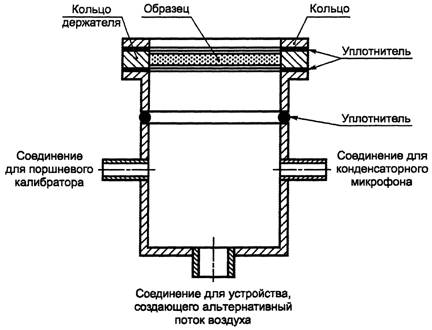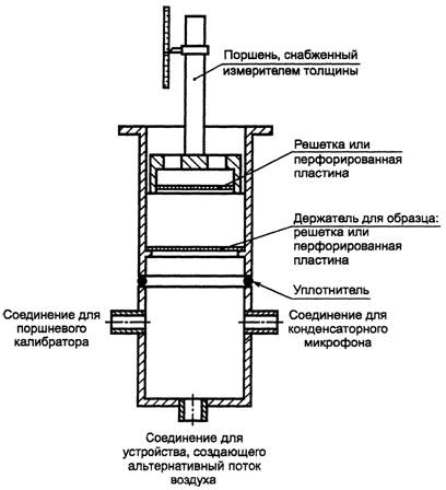 где qvr.m.s. - среднеквадратичное значение объемной скорости переменного потока воздуха, м3/с; А - площадь поперечного сечения образца, м2. Рекомендуется использовать диапазон значений ur.m.s от 0,5 до 4 мм/с. Переменное давление под держателем с образцом измеряют с помощью конденсаторного микрофона, соединенного с измерительным прибором. Измерительный прибор калибруют с помощью поршневого калибратора, соединенного с испытательным объемом, в который помещен образец. При калибровании держатель с образцом герметизируют. При проведении измерений держатель с образцом и соединение поршневого калибратора с испытательным объемом герметизируют. Переменное давление, создаваемое поршневым калибратором peff, Па, определяют по формуле