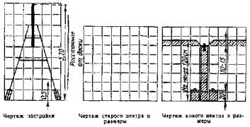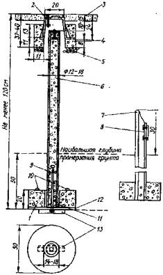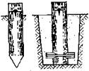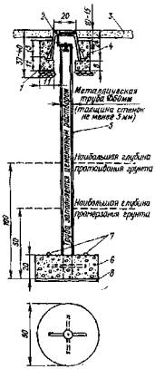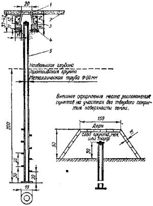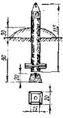 Размеры даны в см Примечание. Центр закладывается бурением или протаиванием грунта, как правило, на незастроенной территории, а также на застроенной территории там, где невозможна установка стенного знака и допустимо производство буровых работ. После пробуривания скважины нижняя часть ее до высоты 50 - 60 см заполняется грунтом текучей консистенции, в который и погружается многодисковый якорь до основания скважины