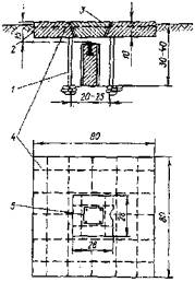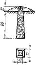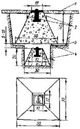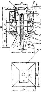 Размеры даны в см Примечание. Центр закладывается, как правило, на незастроенной территории, а также на застроенной территории там, где невозможна установка стенного знака н допустимо производство земляных работ. В случае закладки центра в котлован бетонному якорю придают прямоугольное сечение размером 50´50 см. Для районов многолетней мерзлоты внешнее оформление мест расположения пунктов на участках без твердого покрытия поверхности земли производятся, как для типа 3 г. р.