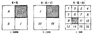 Севернее параллели 60° планы по долготе сдваиваются. На планах показывается сетка прямоугольных координат, линии которой проводятся через 10 см. 2.12. Для топографических планов, создаваемых на города и населенные пункты и на участки площадью менее 20 км2 как правило, а для масштабов 1:1000 и 1:500 всегда применяется прямоугольная разграфка с размерами рамок для масштаба 1:5000 - 40´40 см, для масштабов 1:2000, 1:1000 и 1:500 - 50´50 см. В этом случае за основу разграфки принимается лист масштаба 1:5000, обозначаемый арабскими цифрами. Ему соответствуют 4 листа масштаба 1:2000, каждый из которых обозначается присоединением к номеру масштаба 1:5000 одной из первых четырех прописных букв русского алфавита (А, Б, В, Г), например: 4-Б. Листу масштаба 1:2000 соответствуют 4 листа масштаба 1:1000, обозначаемых римскими цифрами (I, II, III, IV), и 16 листов масштаба 1:500, обозначаемых арабскими цифрами (1, 2, 3, 4, 5,.... 16). Номенклатура листов масштабов 1:1000 и 1:500 складывается из номенклатуры листа масштаба 1:2000 и соответствующей римской цифры для листа масштаба 1:1000 или арабской цифры для листа масштаба 1:500, например: 4-Б-IV. или для 1:500-4-Б-16.(см. прил. 10) Прямоугольная разграфка при съемке населенных пунктов создается с учетом их перспективного развития. На территориях городов, где разграфка установлена, сохраняется принятая разграфка листов. Для топографических планов, создаваемых для мелиоративного строительства на участках площадью более 20 км2 со сложной конфигурацией, как правило, принимается прямоугольная разграфка. Разграфка листов планов обязательно устанавливается в техническом проекте (программе) работ. 2.13.1. Средние погрешности (ошибки)* в положении на плане предметов и контуров местности с четкими очертаниями относительно ближайших точек съемочного обоснования не должны превышать 0,5 мм, а в горных и занесенных районах - 0,7 мм. На территориях с капитальной и многоэтажной застройкой предельные погрешности во взаимном положении на плане точек ближайших контуров (капитальных сооружений, зданий и т.п.) не должны превышать 0,4 мм. *В данной инструкции, как и в других нормативных актах по топографической съемке, при оценке точности для удобства и простоты традиционно принята средняя погрешность. Это основано на практическом опыте контроля топографических работ. Для перехода от средних погрешностей <Θ> к средним квадратическим погрешностям (m) применяется коэффициент 1,4. т.е. m = 1,40. 2.13.2. При создании топографических планов, как исключение, допускается меньшая графическая точность плана. В этих случаях, оговариваемых в технических проектах (программах), топографические планы допускается создавать с точностью планов смежного более мелкого масштаба. Например, планы масштаба 1:5000 могут быть созданы с точностью масштаба 1:10000, а планы масштаба 1:2000 - с точностью масштаба 1:5000 и т.д. В таких случаях на планах за восточной рамкой в обязательном порядке указывается методика их создания (съемка на увеличенных фотопланах, фотомеханическое увеличение планов и т.п.) и точность съемки. 2.14. Средние погрешности съемки рельефа относительно ближайших точек геодезического обоснования не должны превышать по высоте: 1/4 принятой высоты сечения рельефа при углах наклона до 2°; 1/3 при углах наклона от 2 до 6° для планов масштабов 1:5000, 1:2000 и до 10° для планов масштабов 1:1000 и 1:500; 1/3 при сечении рельефа через 0,5 м на планах масшт