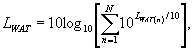 5.3.2 Расчет корректированного по А уровня звуковой мощности LWA Корректированный по А уровень звуковой мощности LWA, дБА, для заданных условий определяют по корректированным по А уровням звуковой мощности в октавных или третьоктавных полосах, полученным по 5.3.1, по формуле