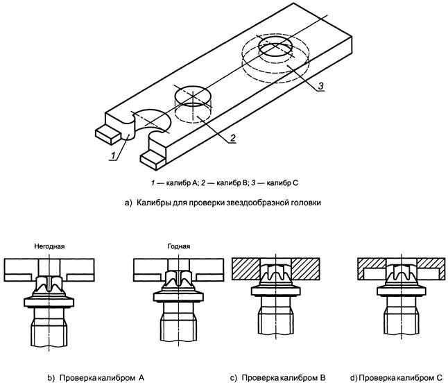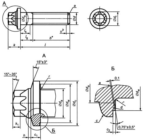 Дата введения - 2009-01-01 1 Область примененияНастоящий стандарт устанавливает размеры, механические характеристики болтов со звездообразной головкой и большим фланцем (далее - болты), номинальным диаметром резьбы от 4 до Проверка калибрами звездообразной головки установлена в приложении А. 2 Нормативные ссылкиВ настоящем стандарте использованы ссылки на следующие стандарты: ГОСТ Р 52627-2006 (ИСО 898-1:1999) Болты, винты и шпильки. Механические свойства и методы испытаний ГОСТ 9.301-86 Единая система защиты от коррозии и старения. Покрытия металлические и неметаллические неорганические. Общие требования ГОСТ 1759.0-87 Болты, винты, шпильки и гайки. Технические условия ГОСТ 1759.1-82 Болты, винты, шпильки, гайки и шурупы. Допуски. Методы контроля размеров и отклонений формы и расположения поверхностей ГОСТ 1759.2-82 Болты, винты и шпильки. Дефекты поверхности и методы контроля ГОСТ 8724-2002 (ИСО 261-98) Основные нормы взаимозаменяемости. Резьба метрическая. Диаметры и шаги ГОСТ 12414-94 (ИСО 4753-83) Концы болтов, винтов и шпилек. Размеры ГОСТ 16093-2004 (ИСО 965-1:1998, ИСО 965-3:1998) Основные нормы взаимозаменяемости. Резьба метрическая. Допуски. Посадки с зазором ГОСТ 17769-83 (ИСО 3269-88) Изделия крепежные. Правила приемки ГОСТ 24705-2004 (ИСО 724:1993) Основные нормы взаимозаменяемости. Резьба метрическая. Основные размеры ГОСТ 27148-86 Изделия крепежные. Выход резьбы. Сбеги, недорезы и проточки. Размеры Примечание - При пользовании настоящим стандартом целесообразно проверить действие ссылочных стандартов в информационной системе общего пользования - на официальном сайте Федерального агентства по техническому регулированию и метрологии в сети Интернет или по ежегодно издаваемому информационному указателю «Национальные стандарты», который опубликован по состоянию на 1 января текущего года, и по соответствующим ежемесячно издаваемым информационным указателям, опубликованным в текущем году. Если ссылочный стандарт заменен (изменен), то при пользовании настоящим стандартом следует руководствоваться заменяющим (измененным) стандартом. Если ссылочный стандарт отменен без замены, то положение, в котором дана ссылка на него, применяется в части, не затрагивающей эту ссылку. 3 Термины и определенияВ настоящем стандарте применены следующие термины с соответствующим определением: звездообразная головка: Головка, имеющая выпукло-вогнутую боковую поверхность, выполненную по радиусам. 4 РазмерыРазмеры указаны на рисунках 1 и 2, а также в таблице 1.