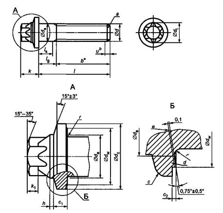 ПредисловиеЦели и принципы стандартизации в Российской Федерации установлены Федеральным законом от 27 декабря 2002 г. № 184-ФЗ «О техническом регулировании», а правила применения национальных стандартов Российской Федерации - ГОСТ Р 1.0-2004 «Стандартизация в Российской Федерации. Основные положения» Сведения о стандарте1 ПОДГОТОВЛЕН Федеральным государственным унитарным предприятием «Центральный ордена Трудового Красного Знамени научно-исследовательский автомобильный и автомоторный институт» (ФГУП «НАМИ») на основе собственного перевода стандарта, указанного в пункте 4 2 ВНЕСЕН Техническим комитетом по стандартизации ТК 229 «Крепежные изделия» 3 УТВЕРЖДЕН И ВВЕДЕН В ДЕЙСТВИЕ Приказом Федерального агентства по техническому регулированию и метрологии от 27 декабря 2007 г. № 496-ст 4 Настоящий стандарт является модифицированным по отношению к германскому национальному стандарту ДИН 34800:2005-09 «Болты и винты с наружной звездообразной головкой и малым фланцем» (DIN 34800:2005-09 «Bolts and screws with external hexalobular driving feature with small flange»), при этом в него не включены ссылки на использование нержавеющих сталей, указывать которые в данном стандарте преждевременно из-за отсутствия идентичных национальных стандартов на нержавеющие стали для холодной высадки и химическую обработку поверхности изделий из этих сталей. Наименование настоящего стандарта изменено относительно наименования указанного национального стандарта для приведения в соответствие с ГОСТ Р 1.5-2004 (подраздел 3.5). Сведения о соответствии ссылочных международных стандартов национальным стандартам Российской Федерации, использованным в настоящем стандарте в качестве нормативных ссылок, приведены в приложении Б 5 ВВЕДЕН ВПЕРВЫЕ Информация об изменениях к настоящему стандарту публикуется в ежегодно издаваемом информационном указателе «Национальные стандарты», а текст изменений и поправок - в ежемесячно издаваемых информационных указателях «Национальные стандарты». В случае пересмотра (замены) или отмены настоящего стандарта соответствующее уведомление будет опубликовано в ежемесячно издаваемом информационном указателе «Национальные стандарты». Соответствующая информация, уведомление и тексты размещаются также в информационной системе общего пользования - на официальном сайте Федерального агентства по техническому регулированию и метрологии в сети Интернет СодержаниеГОСТ Р 52854-2007(ДИН 34800:2005-09) НАЦИОНАЛЬНЫЙ СТАНДАРТ РОССИЙСКОЙ ФЕДЕРАЦИИБОЛТЫ СО ЗВЕЗДООБРАЗНОЙ ГОЛОВКОЙ И МАЛЫМ ФЛАНЦЕМ Технические условия Bolts with star-type head and small flange. Specifications Дата введения - 2009-01-01 1 Область примененияНастоящий стандарт устанавливает размеры, механические характеристики болтов со звездообразной головкой и малым фланцем (далее - болты), номинальным диаметром резьбы от 4 до 20 мм, крупным и мелким шагом, из стали с классами прочности 8.8 и 10.9 для болтов классов точности А и В. Проверка калибрами звездообразной головки установлена в приложении А. 2 Нормативные ссылкиВ настоящем стандарте использованы ссылки на следующие стандарты: ГОСТ Р 52627-2006 (ИСО 898-1:1999) Болты, винты и шпильки. Механические свойства и методы испытаний ГОСТ 9.301-86 Единая система защиты от коррозии и старения. Покрытия металлические и неметаллические неорганические. Общие требования ГОСТ 1759.0-87 Болты, винты, шпильки и гайки. Технические у