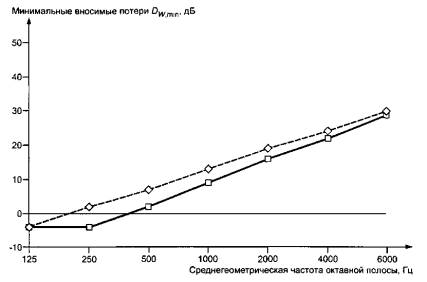 Рисунок 3 - Минимальные вносимые потери для класса С Примечания 1 Снижение уровня звука зависит от спектра источника шума. Некоторые типичные примеры приведены в 5.5 и 5.6. 2 Акустическая изоляция может уменьшить звуковое излучение трубы, но при этом возникает противоположный эффект: поскольку площадь обшивки больше площади поверхности трубы без акустической изоляции (далее - необлицованная труба), излучение из-за вибрации обшивки может уменьшить звукоизоляцию. Кроме того, на низких частотах обшивка может излучать более интенсивно, чем труба. Эти эффекты, более значительно проявляющиеся на трубах малого диаметра, ограничивают обеспечение требуемого класса звукоизоляции. Акустическая изоляция может также резонировать на низкой частоте в зависимости от массы обшивки, упругости воздуха в замкнутом объеме и упругости пористого слоя. Резонансную частоту f0 Гц, если влияние жесткости пористого материала невелико, приблизительно рассчитывают по формуле
