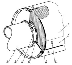 1 - труба; 2 - торцевая заглушка; 3 - виброакустическая изоляция [рисунок С.2а)]; 4 - бандажное кольцо; 5 - пористый слой; 6 - перекрытие по шву (продольный шов на деталях 4 и 5 для предохранения от попадания влаги); 7 - обшивка; 8 - крепление обшивки: заклепки, винты (не применяют, когда обшивку накладывают непосредственно на пароизолирующее покрытие) или коррозионно-стойкие стальные скобы
