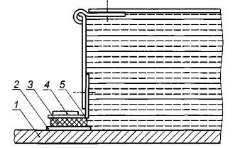 1 - перекрытие от 100 до 300 мм; 2 - обшивка; 3 - стеклоткань; 4 - перфорированный лист; 5 - виброизолирующий герметик (если требуется торцевая заглушка)