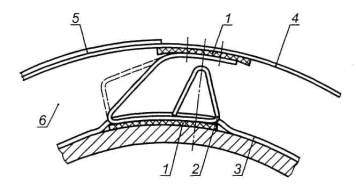 1 - упругая подушка; 2 - упругая опора обшивки; 3 - бандажное кольцо; 4 - опорное кольцо для обшивки; 5 - обшивка; 6 - воздушный зазор (может быть предусмотрен при наличии пористого слоя)