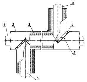 1 - труба; 2 - обшивка; 3 - пористый слой; 4 - винты или заклепки; 5 - мастичный герметик; а - верхний патрубок; b - нижний патрубок