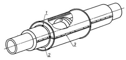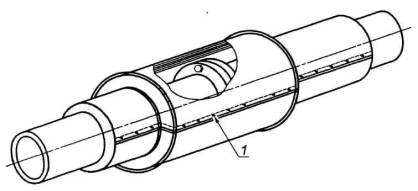 1 - обшивка облицованной трубы; 2 - клейкий мастичный герметик; 3 - формованный профиль; 4 - бандажное кольцо (коррозионно-стойкое); 5 - обшивка