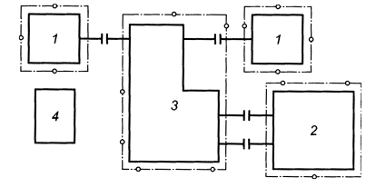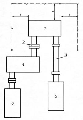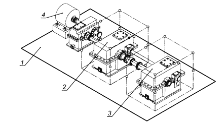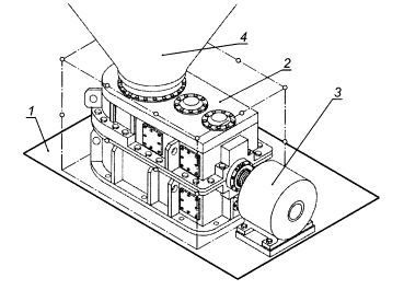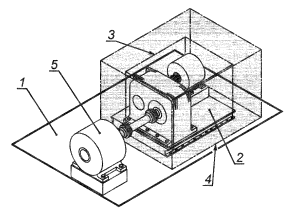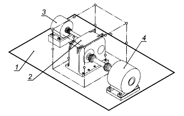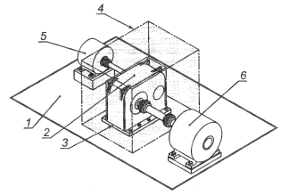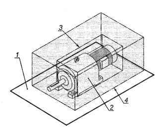 1 - пол; 2 - редуктор; 3 - огибающий параллелепипед; 4 - измерительная поверхность; 5 - двигатель; 6 - нагрузочное устройство Рисунок 1 - Огибающий параллелепипед и измерительная поверхность для редуктора