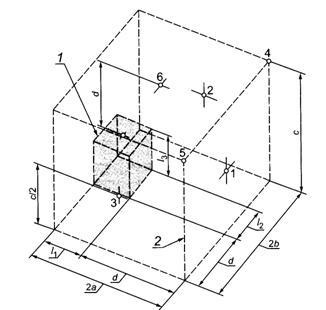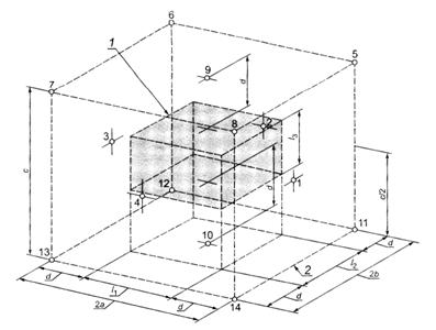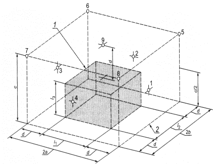 Рисунок 10 - Пример редуктора, установленного на большом расстоянии от звукоотражающей поверхности 1 - огибающий параллелепипед; 2 - измерительная поверхность Рисунок 11 - Точки измерений для рисунка 10 5.4. Неопределенность измерений Неопределенность измерений соответствует установленной примененным стандартом. Примечание - Результаты измерений могут быть искажены влиянием условий измерений (вибрацией, электрическим и магнитным полями, ветром или газовым потоком, ненормальной температурой и т.д.), 6. Определение уровня звука излучения6.1. Основной стандарт Уровень звука излучения на рабочем месте (см. 6.2) определяют по ГОСТ 30720 (метод с рассчитываемым значением величины Q2, определяющей связь уровня звука излучения с корректированным по А уровнем звуковой мощности), который позволяет рассчитать средний на измерительной поверхности (см. 5.3.3) уровень звука излучения по известному корректированному по А уровню звуковой мощности. Если значение Q2 не может быть определено, то метод измерения уровня звука излучения выбирают по ГОСТ 31171. 6.2. Рабочее место Если рабочее место у