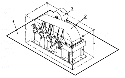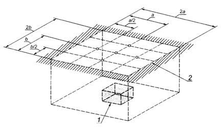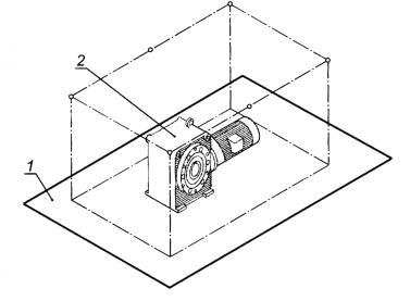 Рисунок 8 - Пример редуктора, установленного в колодце с акустически жесткими звукоотражающими стенками 1 - огибающий параллелепипед: 2 - измерительная поверхность Рисунок 9 - Точки измерений для рисунка 8
