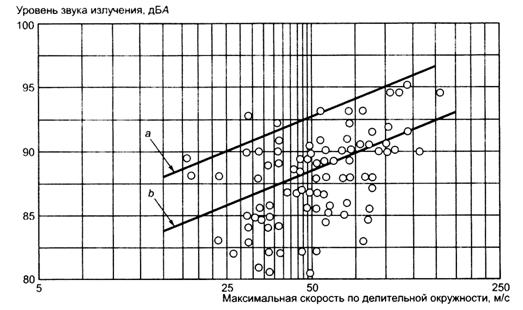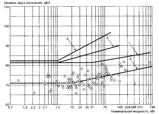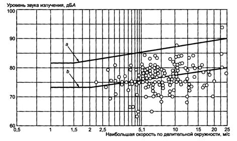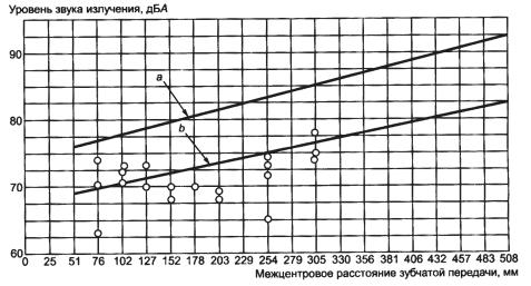 Типичные уровни звука излучения одноступенчатого редуктора с параллельными валами с зубьями четвертой или меньшей степени точности в 1 мот корпуса в зависимости от передаваемой мощности показаны на рисунке В.13 [3].