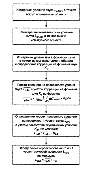На рисунке С.1 показана последовательность действий при определении корректированного по А уровня звуковой мощности.