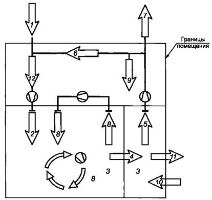 1 - удаляемый воздух; 2 - рекуператор тепла; 3 - вытяжной воздух; 4 - наружный воздух; 5 - приточный воздух; 6 - давление