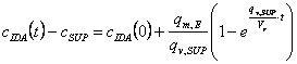 где qm,E - интенсивность выделения загрязнений в помещении, мг/с; сIDA - допустимая концентрация выделения загрязнений в помещении, мг/м3; cSUP- концентрация выделения загрязнений в приточном воздухе, мг/м3. Следует определить все возможные источники выделения загрязнений. Как правило, снижение выделения загрязнений является предпочтительным решением по сравнению с вентиляцией. По формуле (5) расход приточного воздуха вычисляют для установившегося состояния с продолжительными постоянными выделениями. Если период выделения загрязнений краток, то равнозначное значение концентрации может быть не достигнуто, или расход воздуха может быть снижен с учетом заданного максимального уровня концентрации. Зависимость концентрации от времени вычисляют по формуле (расход приточного воздуха равен расходу вытяжного воздуха)