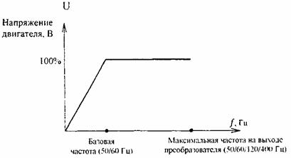 Рис. 4 Зависимость напряжения двигателя от базовой частоты Максимальная частота - это наибольшая возможная частота (50, 60, 120 или 400 Гц), которая может быть на выходе преобразователя частоты. Оптимальная характеристика отношения напряжения к частоте (U/f) может быть выбрана в соответствии с характеристикой момента нагрузки [2]. Нагрузочная характеристика механизма с постоянным моментом сопротивления Такую нагрузочную характеристику имеют различные транспортеры, шнеки, каландры, т.е. при изменении частоты вращения двигателя величина момента сопротивления механизма остается постоянной, равной номинальному значению. Нагрузочная характеристика механизма с изменяющимся моментом сопротивления Нагрузочная характеристика механизма с изменяющимся моментом сопротивления характерна для центробежных вентиляторов и насосов. Изменение момента сопротивления механизма пропорционально квадрату частоты вращения вала двигателя.
