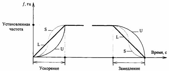 Рис. 5 Зависимость напряжения от частоты на выходе преобразователя при разном характере нагрузки а) - нагрузка с постоянным моментом сопротивления; б) - нагрузка с изменяемым моментом сопротивления. Кривые ускорения и замедления двигателя Время, за которое достигается максимальная частота вращения двигателя при управлении двигателем по закону соотношения U/f, называется временем ускорения. Время от максимальной частоты вращения до остановки двигателя называется временем замедления. Ускорение и замедление может осуществляться как по линейной зависимости, так и по S и U-образным кривым в зависимости от характера нагрузки.