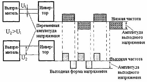 Преобразователь частоты источник напряжения в свою очередь подразделяется на два типа. Первый - ПЧ АИМ с амплитудной импульсной модуляцией (АИМ) и второй - ПЧ ШИМ с широтно-импульсной модуляцией (ШИМ). Амплитудная импульсная модуляция - это метод управления, при котором изменение амплитуды импульса напряжения (высоты импульса) на входе выпрямителя синхронно приводит к изменению частоты на выходе из инвертора. Объяснение этого принципа представлено на рис. 8.