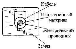 Рис. 9 Расположение кабеля под землей d1 - диаметр токоведущего проводника, мм; d2 - диаметр наружной оболочки кабеля, мм Расчет электростатической емкости для кабеля, проложенного под землей, осуществляется по формуле [1]