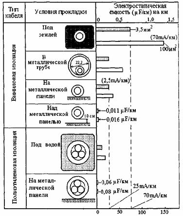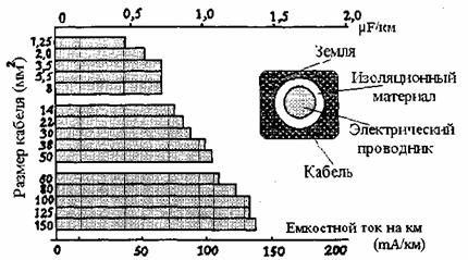 Рис. 11 Зависимость емкостного тока и электростатической емкости от поперечного кабеля и его длины