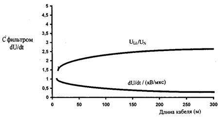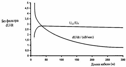 Рис. 13 Вариант схемы для уменьшения величины падения напряжения на линии преобразователь частоты - электродвигатель ПЧ - преобразователь частоты, ЭД - электродвигатель Кабель двигателя должен быть как можно короче, чтобы исключить электромагнитную эмиссию, а также уменьшить емкостной ток. Изменения напряжения на выходе преобразователя частоты вызывают емкостной ток через паразитные емкости кабеля двигателя. Рекомендуется, чтобы длина кабеля двигателя не превышала 300 м. При параллельно подключенных электродвигателях длины отдельных кабелей суммируются. Преобразователи частоты, инверторы которых выполнены на биполярных транзисторах с изолированным затвором (IGBT), имеют амплитуды импульсов выходного напряжения, независимо от выходной частоты, приблизительно в 1,5 раза превышающие напряжение сети с очень коротким временем нарастания. Напряжение на зажимах двигателя, в зависимости от свойств его кабеля, может почти удваиваться. Фильтры типа dU/dt подавляют пики выходного напряжения преобразователя частоты и быстрые изменения напряжения, которые пагубно действуют на изоляцию электродвигателя. Кроме того, фильтры dU/dt уменьшают высокочастотное излучение кабеля электродвигателя, высокочастотные потери и токи в подшипниках электродвигателя, а также они используются с двигателями, у которых величина диэлектрического сопротивления изоляции неизвестна или недостаточна. Необходимость применения фильтра dU/dt определяется изоляцией электродвигателя. На рис. 14 представлены зависимости линейного пикового напряжения на зажимах двигателя (ULL) и времени нарастания (Dt) от длины кабеля при отсутствии и при наличии фильтра dU/dt.