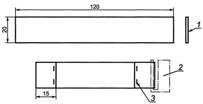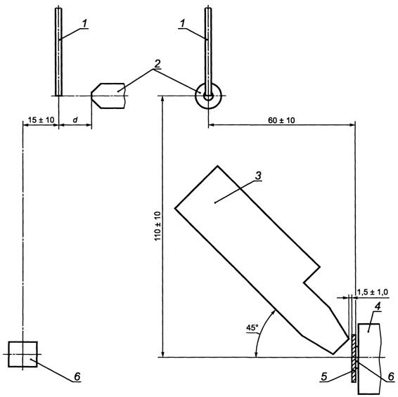 1 - лицевая поверхность; 2 - захват; 3 - скобка Рисунок 6 - Испытуемый образец Вырезают не менее 10 испытуемых образцов. Испытуемый образец кондиционируют не менее 24 ч при относительной влажности (65 ± 2) % и температуре (20 ± 2)°С в соответствии с требованиями [2]. 6 Метод определения устойчивости к воздействию брызг расплавленного металлаМеры безопасности Под воздействием расплавленного металла органические материалы могут разлагаться с образованием вредных веществ. Поэтому испытания в соответствии с данным методом необходимо проводить в камере, где возможно включение воздушной вытяжки после завершения каждого опыта. Необходимо пользоваться защитными перчатками перед тем, как брать горячие предметы. Если во время проведения испытаний требуется тщательный осмотр устройства или образца, то необходимо обеспечивать защиту глаз и лица. Под образцом следует устанавливать соответствующий каплеуловитель. 6.1 Условия проведения испытанийИспытания проводят в защищенном от сквозняков помещении, без источников тепла, за исключением тех, которые требуются для испытаний. Температура в помещении во время проведения испытаний с каждым образцом не должна изменяться более чем на ± 5 К. Перед проведением испытаний температуру датчика (изолирующей опоры и образца) доводят до температуры окружающей среды с предельно допустимым отклонением ± 2 К. 6.2 Подготовка и регулирование металлического стержняРасход (10 ± 1) г/мин стального стержня в соответствии с 4.5 обеспечивается соответствующей скоростью мотора. Положение сварочной горелки и расход газов регулируют для обеспечения образования капель массой m при частоте f. Массу капли m определяют взвешиванием стержня до и после расплавления 20 капель и деления разницы в массе на 20. Частоту определяют по времени, определенному по секундомеру, которое необходимо для образования данного количества капель, исключая время до образования первой капли. Для расчета в соответствии с 6.3 масса капли m и частота f должны быть следующими: - m = (0,50 ± 0,03) г; - f = 20 капель за (60 ± 3) с. В качестве начальных условий рекомендуются следующие: - давление кислорода - 250 кПа1) (250∙103 Н/м2); - давление ацетилена - 50 кПа (50∙103 Н/м2); - расстояние от стержня до сопла горелки - - высота темно-голубого конуса пламени - 1) 1 кПа = 103 Н/м2. Рекомендуется также пользоваться минимально возможными расходами газов для минимизации риска сдувания или разбрызгивания капель пламенем. Стержень необходимо устанавливать в самом горячем месте пламени, то есть непосредственно на острие темно-голубого конуса. 6.3 Порядок проведения испытанийДержатель образца в соответствии с 4.4 размещают так, чтобы вертикальное расстояние между центром сопла горелки и центральной горизонтальной линией датчика в соответствии с 4.3 составляло (110 + 10) мм. Расстояние по горизонтали между осью стержня и вертикальной плоскостью поверхности датчика устанавливают равным (60 ±10) мм. Расстояние между осью стержня и плоскостью, проходящей через центральную вертикальную линию датчика перпендикулярно к его поверхности, устанавливают равным (15 ± 10) мм со стороны, противоположной соплу горелки (см. рисунок 1). Направляющее приспособление для капель в соответствии с 4.2 наклоняют на 45°; при этом необходимо убедиться, что капли металла легко улавливаются и летят на испытуемый образец на уровне датчи