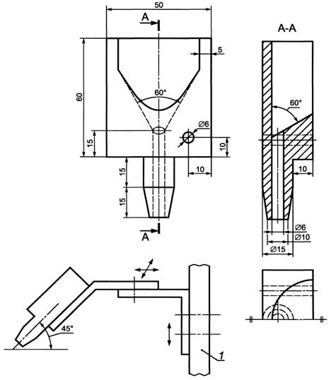 1 - стальной стержень; 2 - сопло горелки; 3 - направляющее приспособление для капель; 4 - блок опоры датчика; 5 - испытуемый образец; 6 - датчик Рисунок 1 - Расположение испытательного оборудования для образования капель расплавленного металла 1 - рама; 2 - линии отверстий для крепления направляющего приспособления; 3 - сварочная горелка; 4 - система для регулирования расстояния d; 5 - кольцо-держатель; 6 - противовес; 7 - трос; 8 - мотор; 9 - шкив; 10 - зажим; 11 - стальной стержень; 12 - корпус горелки; 13 - сопло горелки Рисунок 2 - Устройство для образования капель расплавленного металла 4.2 Направляющее приспособление для капель (см. рисунок 3)Устройство предназначено для сбора капель и направления их к вертикально ориентированному испытуемому образцу. Устройство должно иметь раструб, изготовленный из фторопластового полимера1), и опору с регулировкой во всех трех плоскостях. Раструб крепят под наклоном в 45° к горизонтальной плоскости; его цилиндрическая часть должна обеспечивать прохождение стержня диаметром (5,0 ± 0,2) мм. Когда направляющее приспособление для капель не используется, его верхняя часть закрывается крышкой.