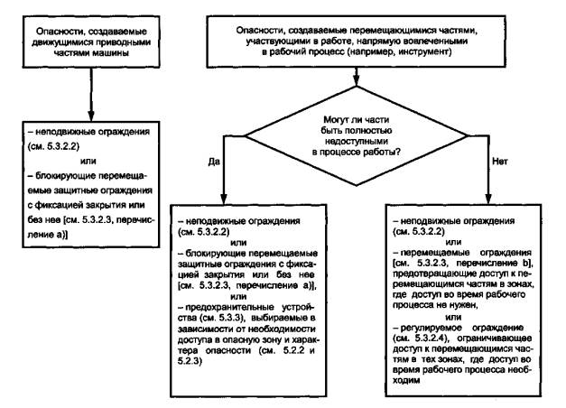 Рисунок 1 - Рекомендации по выбору защитных ограждений и предохранительных устройств, защищающих от опасностей, создаваемых движущимися частями машин 5.2.2 Выбор ограждений и предохранительных устройств, если доступ оператора в опасную зону в процессе нормальной работы не требуется Если в процессе нормальной работы машины доступ оператора в опасную зону не требуется, рекомендуется выбирать следующие защитные ограждения и предохранительные устройства: a) неподвижное ограждение (ИСО 14120 [43]); b) перемещаемое блокирующее ограждение с фиксацией закрытия или без него (ИСО 14119 [42], ИСО 14120 [43] и 5.3.2.3); c) автоматически закрывающееся перемещаемое ограждение (ИСО 14120, пункт 3.3.2 [43]); d) сенсорное предохранительное оборудование, например электрочувствительный датчик (МЭК 61496-1 [17], МЭК 61496-2 [18]) или коврик, реагирующий на давление (ИСО 13856-1 [40]). 5.2.3 Выбор ограждений и предохранительных устройств, если доступ оператора в опасную зону в процессе нормальной работы необходим Если в процессе нормальной работы машины требуется доступ оператора в опасную зону, рекомендуется выбирать следующие защитные ограждения и предохранительные устройства: a) перемещаемое блокирующее ограждение с фиксацией закрытия или без него (ИСО 14119 [42], ИСО 14120 [43] и 5.3.2.3); b) сенсорное предохранительное устройство, например электрочувствительный датчик (МЭК61496-1 [17], МЭК61496-2 [18]); c) регулируемое ограждение; d) автоматически закрывающееся перемещаемое ограждение (ИСО 14120, пункт 3.3.2 [43]); e) двуручное устройство управления (ИСО 13851 [35]); f) перемещаемое блокирующее ограждение с функцией пуска (управляющее защитное ограждение) (см. 5.3.2.5). 5.2.4 Выбор ограждений и предохранительных устройств, если доступ в опасную зону необходим для наладки, программирования методом обучения, переключения режимов, обнаружения неисправностей, очистки или технического обслуживания машины Машины по возможности следует проектировать так, чтобы ограждения, предусмотренные для защиты оператора, могли также обеспечивать защиту персонала, осуществляющего наладку, программирование методом обучения, переключение режимов, отыскание неисправностей, очистку или техническое обслуживание, не затрудняя выполнение персоналом вышеуказанных рабочих операций. Эти работы должны идентифицироваться и рассматриваться при общей оценке риска как составная часть процесса эксплуатации машины (ИСО 12100-1, пункт 5.3). Примечание - Отключение энергоснабжения и рассеивание остаточной энергии при выключении машины (см. 5.54, ИСО 14118, пункт 4.1, и раздел 5 [41]) должны обеспечивать максимальный уровень безопасности при выполнении этих работ (особенно по обслуживанию и ремонту), если не требуется подключение машины к источнику энергоснабжения. 5.2.5 Выбор и применение сенсорных предохранительных устройств 1) __________ 1)Более подробное описание дается в международном стандарте МЭК 62046 [20]. 5.2.5.1 Выбор Из-за большого разнообразия принципов, на которых основывается функция обнаружения, различные типы сенсорных предохранительных устройств подходят для применения в системах обеспечения безопасности далеко не в равной степени. В приведенной ниже информации предоставляются для конструктора критерии, в соответствии с которыми для каждого конкретного случая следует выбирать наиболее подходящее(ие) предохранительное(ые) устройство(а). Примеры сенсорных 