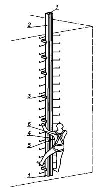 1 - место присоединения/отсоединения; 2 - жесткая анкерная линия; 3 - кронштейн; 4 - средство защиты ползункового типа; 5 - строп; 6 - страховочная привязь Рисунок 2 Пример страховочной системы со средством защиты на жесткой анкерной линии 3.3 Страховочная система со средством защиты ползункового типа на гибкой анкерной линии Пример страховочной системы со средством защиты ползункового типа на гибкой анкерной линии изображен на рисунке 3. Функция рассеивания энергии может выполняться либо между устройством ползункового типа и анкерной линией, либо амортизатор интегрирован в строп или в анкерную линию. Средство защиты ползункового типа с гибкой анкерной линией описано в ЕН 353-2 [3].