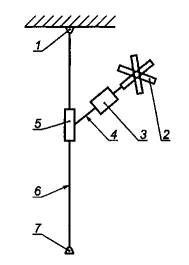 1 - анкерная точка опоры; 2 - страховочная привязь; 3 - амортизатор; 4 - строп; 5 - средство защиты ползункового типа; 6 - гибкая анкерная линия; 7 - конец или закрепленное нижнее концевое соединение Рисунок 3 Пример страховочной системы со средством защиты ползункового типа на гибкой анкерной линии 3.4 Страховочная система с амортизатором Пример страховочной системы с амортизатором изображен на рисунке 4. Амортизатор можно устанавливать также в анкерной точке крепления. Амортизаторы описаны в ЕН 355 [4].