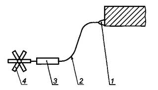 1 - анкерная точка опоры; 2 - средство защиты втягивающегося типа; 3 - втягивающийся строп; 4 - страховочная привязь Рисунок 1 Пример страховочной системы со средством защиты втягивающегося типа 3.2 Страховочная система со средством защиты ползункового типа на жесткой анкерной линии Пример страховочной системы со средством защиты ползункового типа на жесткой анкерной линии изображен на рисунке 2. Функция рассеивания энергии может выполняться либо между устройством ползункового типа и анкерной линией, либо амортизатор интегрирован в строп или в анкерную линию. Средство защиты ползункового типа на жесткой анкерной линии описано в ЕН 353-1 [2].