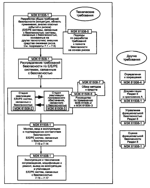 Рисунок 1 - Общая структура настоящего стандарта В обязанности технического комитета входит использование (где возможно) базовых стандартов по безопасности при подготовке собственных стандартов. В этом случае требования, методы или условия проверки настоящего базового стандарта по безопасности не будут применяться, если это не указано специально, или будут включаться в стандарты, подготовленные этими техническими комитетами. Примечания 1. Функциональная безопасность систем Е/Е/РЕ, связанных с безопасностью, может достигаться только в случае, если удовлетворены все установленные для них требования. Поэтому важно, чтобы все эти требования были тщательно проанализированы и обоснованы. 2. В США и Канаде до тех пор, пока стандарты для конкретного сектора применения стандартов МЭК 61508 (например, МЭК 61511 [1]) не будут опубликованы в качестве международных стандартов США и Канады, существующие там национальные стандарты по безопасности в обрабатывающих секторах, основанные на МЭК 61508 могут быть применены вместо МЭК 61508. 1.3. Структура серии стандартов МЭК 61508-1 - МЭК 61508-7 показана на рисунке 1, а также указана роль МЭК 61508-2 в достижении функциональной безопасности Е/Е/РЕ систем, связанных с безопасностью. МЭК 61508-6 (приложение А) содержит описание применения МЭК 61508-2 и МЭК 61508-3. 2. Нормативные ссылкиВ настоящем стандарте использованы нормативные ссылки на следующие стандарты: МЭК 60050-371:1984 Международный электротехнический словарь, Глава 371. Телеуправление МЭК 60300-3-2:2004 Управление общей надежностью, Часть 3. Руководство по применению. Полевой сбор данных по общей надежности МЭК 61000-1-1:1992 Электромагнитная совместимость (ЭМС). Часть 1. Общие положения - Раздел 1: Применение и интерпретация фундаментальных определений и терминов МЭК 61000-2-5:1995 Электромагнитная совместимость (ЭМС). Часть 2. Окружение. Раздел 5. Классификация электромагнитного окружения МЭК 61508-1:1998 Функциональная безопасность систем электрических, электронных, программируемых электронных, связанных с безопасностью, Часть 1. Общие требования МЭК 61508-3:1998 Функциональная безопасность систем электрических, электронных, программируемых электронных, связанных с безопасностью. Часть 3. Требования к программному обеспечению МЭК 61508-4:1998 Функциональная безопасность систем электрических, электронных, программируемых электронных, связанных с безопасностью. Часть 4. Термины и определения МЭК 61508-5:1998 Функциональная безопасность систем электрических, электронных, программируемых электронных, связанных с безопасностью. Часть 5. Примеры методов для определения уровней полноты безопасности МЭК 61508-6:2000 Функциональная безопасность систем электрических, электронных, программируемых электронных, связанных с безопасностью. Часть 6. Руководство по применению МЭК 61508-2:2000 и МЭК 61508-3:1998 МЭК 61508-7:2000 Функциональная безопасность систем электрических, электронных, программируемых электронных, связанных с безопасностью. Часть 7. Анализ методов и средств ИСО/МЭК 51:1999 Руководство по включению в стандарты аспектов, связанных с безопасностью МЭК Руководство 104:1997 Руководство по подготовке стандартов, связанных с безопасностью, и по роли комитетов с функциями определения направлений и разработки стандартов в области безопасности IEEE 352:1987 Руководство IEEE по основным принципам анализа надежности систем безопас